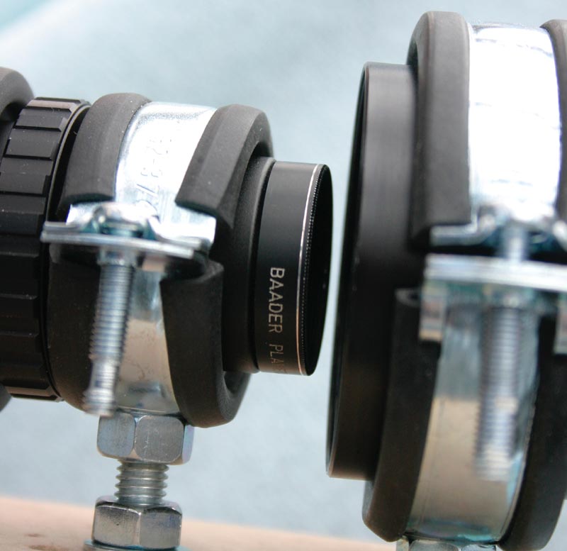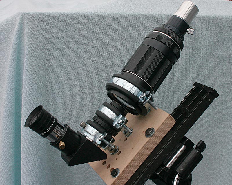 Am hinteren Adapter ist ein Zenitspiegel befestigt. Neben einer komfortableren Beobachungshaltung hat dies den Vorteil, dass bei Verwendung von Barlowlinsen und unterschiedlichen Okularen grobe Lichtwegunterschiede per Schiebefokussierung ausgeglichen werden können. Die Feinfokussierung erfolgt dann über das Teleobjektiv. Gegen Streulicht kann es erforderlich sein, den Bereich zwischen Gitter und Kollimator mit einer Aluminiumfolie (oder besser noch mit einer alubeschichteten PE-Folie etwa aus Lebensmittelverpackungen) abzudecken.