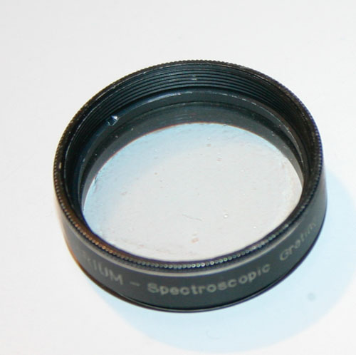 Im Oktober 2008 unternahm ich meine ersten Schritte auf dem Gebiet der astronomischen Spektroskopie. Ein vorhandenes Blaze-Gitter von Baader Planetarium mit 207 Linien/mm diente zunächst ersten Experimenten zur Gewinnung von spaltlosen Sternspektren. Dabei wurde das Gitter direkt in die 1,25" Steckhülse einer Philipps ToUCam (Webcam) bzw. einer TIS DMK21AF04 (industr. Video-Überwachungskamera) geschraubt und in den Okularauszug meines 32cm Newton-Teleskops gesteckt. Weil das Gitter für einen hohe Auflösung möglichst im parallelen Strahlengang eingesetzt werden muß, blendete ich das Teleskop mit einer Pappblende (Öffnung 10cm) ab. Daraus resultierte (bei einer primären Brennweite von 152 cm) ein Öffnungsverhältnis von f/15. Ein noch stärkeres Abblenden würde zwar das Öffnungsvehältnis weiter vergrößern, die geringere Beleuchtung von Spalt und Sensor würde aber insgesamt nachteilig wirken. Als Sensor setzte ich zunächst die Philipps ToUCam ein. Allerdings blieben die Ergebnisse unter meinen Erwartungen, so dass ich im weiteren nur noch die DMK 31AF03 einsetzte, die deutlich kontrastreichere Spektralbilder lieferte. Für den Einsatz als visuelles Beobachtungsgerät (als Spektroskop) kann eine Zylinderlinse auf das Okular aufgesteckt werden, um den dünnen Spektralfaden aufzuweiten. Die visuelle Beobachtung von Sternspektren hat beispielsweise bei öffentlichen Sternwartenführungen durchaus einen gewissen Reiz, weil hier Astrophysik live demonstriert werden kann. Besonders geeignet als Demonstrationsobjekte sind die hellen A-Sterne wie Wega, Atair usw., die kontrastreiche Balmerlinien zeigen.