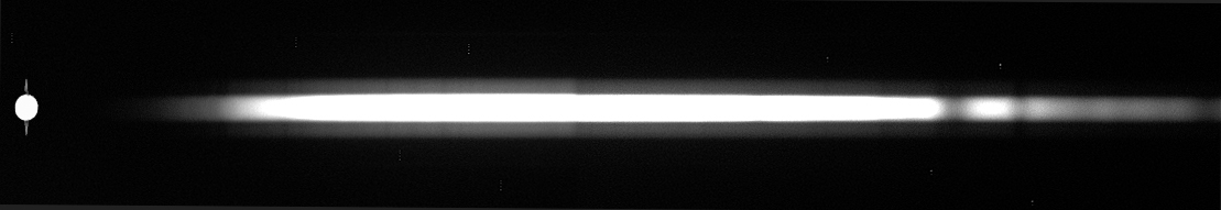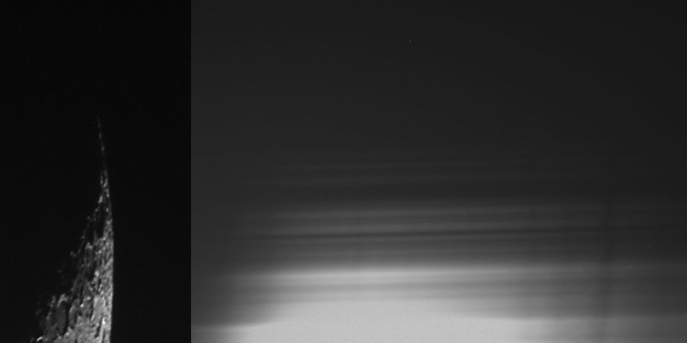 Montage: Rohspektrum Mond. Nur die schmalen Ausläufer der Sichel bilden die Absorptionslinien des Sonnenspektrums erkennbar ab. Spektrum des Mondes