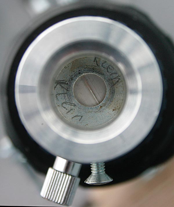 Der einfache Experimentalspektrograph beinhaltet einen selbstgefertigten Spalt. Er wird aus zwei Fragmenten einer Rasierklinge hergestellt, die mit kleinen Magneten auf einer passend gedrehten Unterlegscheibe fixiert und dann in die richtige Position geschoben werden. Mit etwas Sekundenkleber läßt sich der Spalt leicht fixieren, die Magnete können später entfernt werden. Durch den sehr einfachen und kostengünstigen Aufbau lassen sich je nach Einsatzzweck schnell verschieden breite Spalte bauen und einsetzen. Als Halterung für die Spalt-Scheiben dient eine Aluminium-Steckhülse, die von einem hilfsbereiten Vereinskollegen angefertigt wurden. Der Hülsendurchmesser beträgt auf beiden Seiten 1,25" und dient damit auch als Verbindungsstück zwischen Spektrograph und Okularauszug des Teleskops. Etwa in der Mitte der Hülse wurde eine Auflage für die Spaltscheiben abgesetzt, seitlich mündet an dieser Stelle ein Klemmschraube zur Fixierung der Spaltscheibe. Aufgabe des Spaltes ist es, aus einem flächigen Objekt, z.B. Sonnescheibe oder Emmissionsnebel, einen sehr schmalen Bereich auszuschneiden, der vom Gitter auf der Sensorebene als feine Lichtlinie abgebildet wird. Je schmaler der Spalt ist, um so feiner und genauer (besser aufgelöst) ist das resultierende Spektrum. Der hier gezeigte Aufbau ist bei weitem nicht perfekt und ich hoffe, durch weitere Verbesserungen am Spalt die Güte der Spektren noch verbessern zu können.