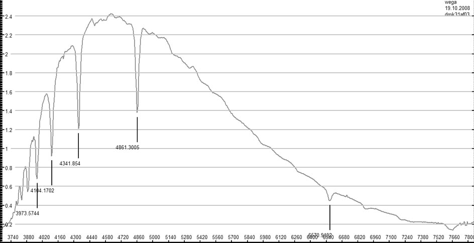 Der letzte Schritt liefert ein kalibriertes Spektrogramm. Für Windows-User bietet sich zur Auswertung der Spektren z.B. das ganz hervorragende Freeware-Programm VisualSpec von Valerie Desnoux an. Eine genaue Beschreibung des Programms findet sich auf der Interneteite von Valerie Desnoux. Die Intensität der verschiedenen Spektralbereiche ersutliert maßgeblich aus der spezifischen Empfindlichkeit der Kamerasensoren für die jeweilen Wellenlängen. CCD-Chips sind besonders im visuellen Bereich und nahen Infrarot empfindlich. Im nahen UV-Bereich fällt die Empfindlichkeit sehr schnell ab.