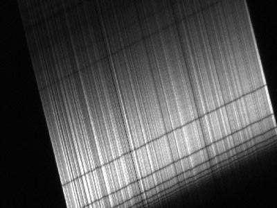 Auch die schmale Mondsichel eignet sich begrenzt als "Pseudospalt", wenn nur die äußersten Ausläufer spektroskopiert werden. Allerdings ist die Breite der "Lichtspalte" vergleichsweise groß und die Überlappung der "Spaltbilder" dementsprechend stark. Immerhin können in einem solchen Spektrum die kräftigsten Linien des Sonnenspektrum eindeutig identifiziert werden.