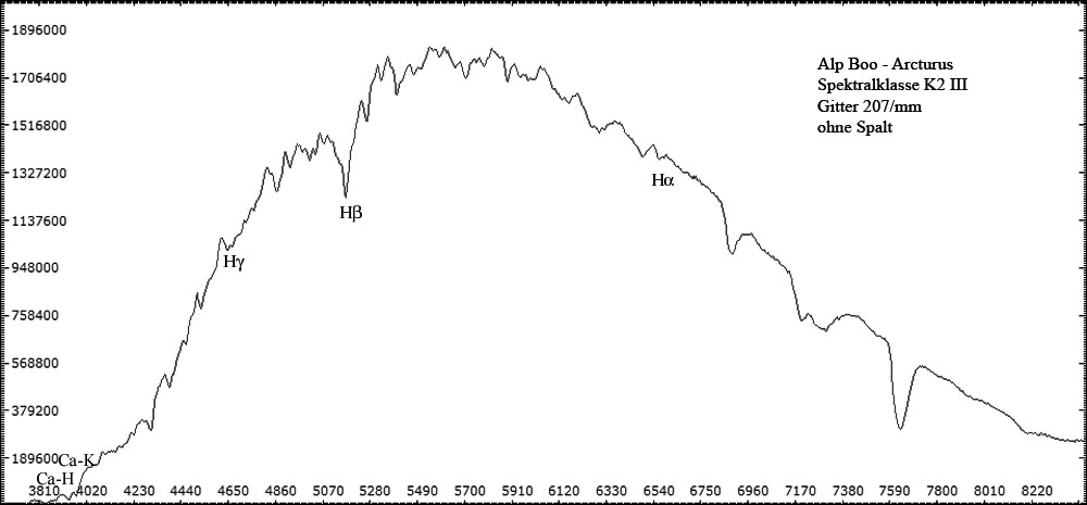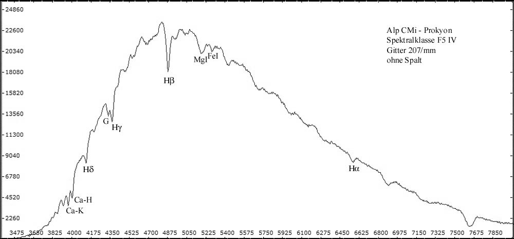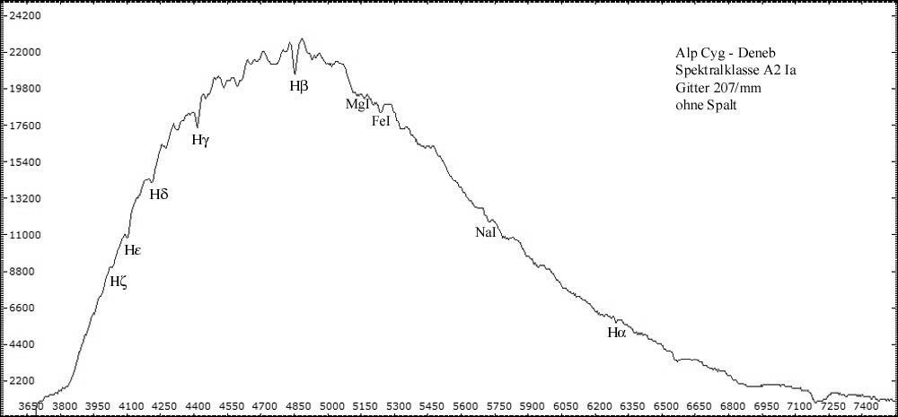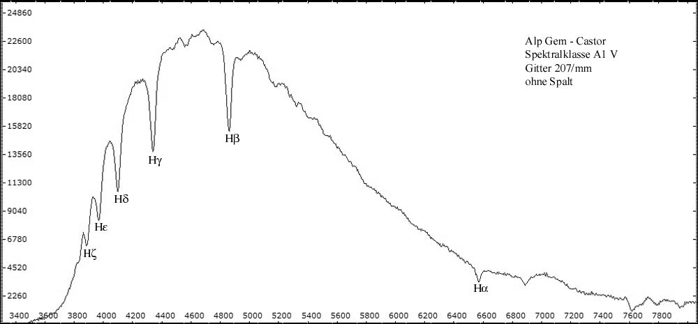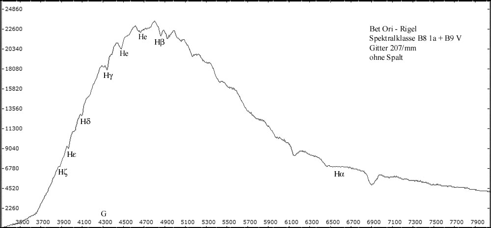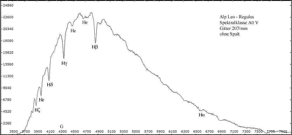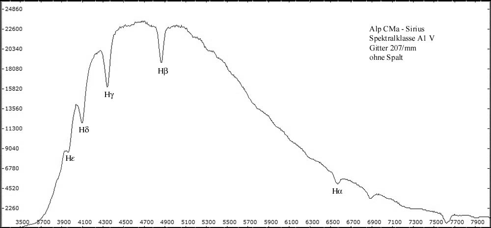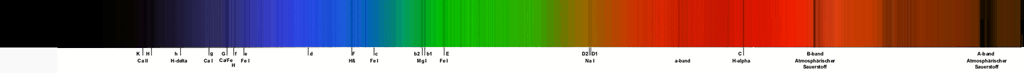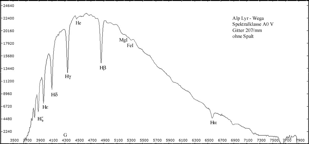 Alle spaltlosen Spektren wurden mit 32cm Newton (f = 1520 mm ) - abgeblendet auf 10cm - im Primärfokus aufgenommen. Resultierendes Öffnungsverhältnis: f/15. Eingesetzt wurde das 1,25" Baader Blaze-Gitter mit 207 Linien/mm. Die Spaltspektren wurden mit dem Experimentalspektrographen (Details hier) aufgenommen. Spektrogramme sind kalibriert, aber nicht normiert. Die Intensität der verschiedenen Spektralbereiche ersutliert maßgeblich aus der spezifischen Empfindlichkeit der Kamerasensoren für die jeweilen Wellenlängen. CCD-Chips sind besonders im visuellen Bereich und nahen Infrarot empfindlich. Im nahen UV-Bereich fällt die Empfindlichkeit sehr schnell ab -> Spektrale Empfindlichkeit der verwendeten DMK Kameras.